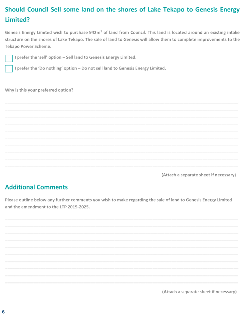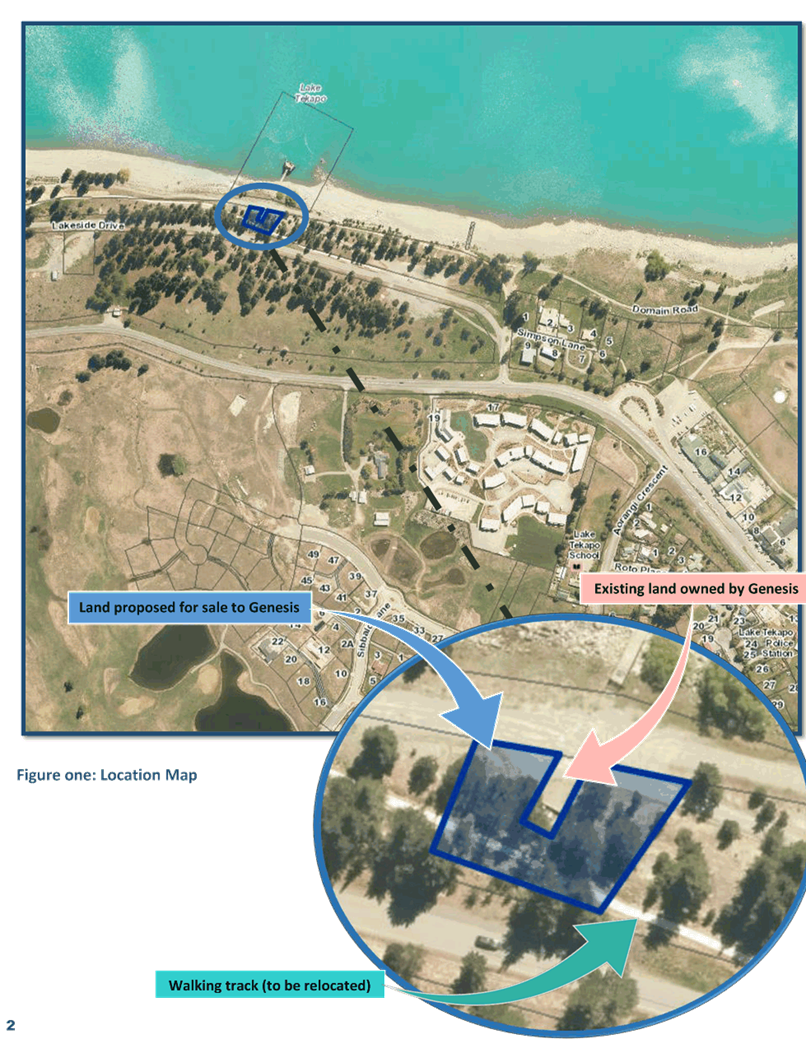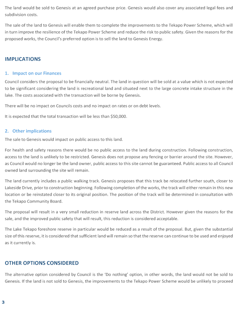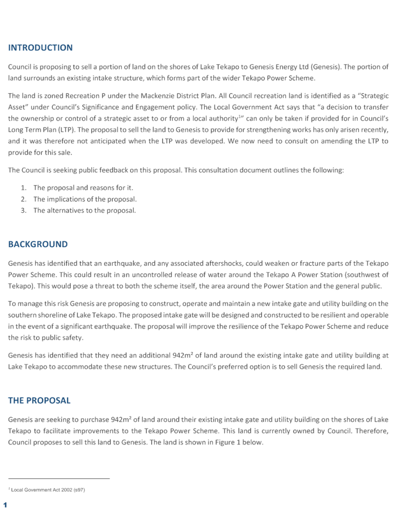 Purpose of Report To seek approval of the Draft Consultation Document (CD) for the proposed sale of land to Genesis Energy Limited at Lake Tekapo.