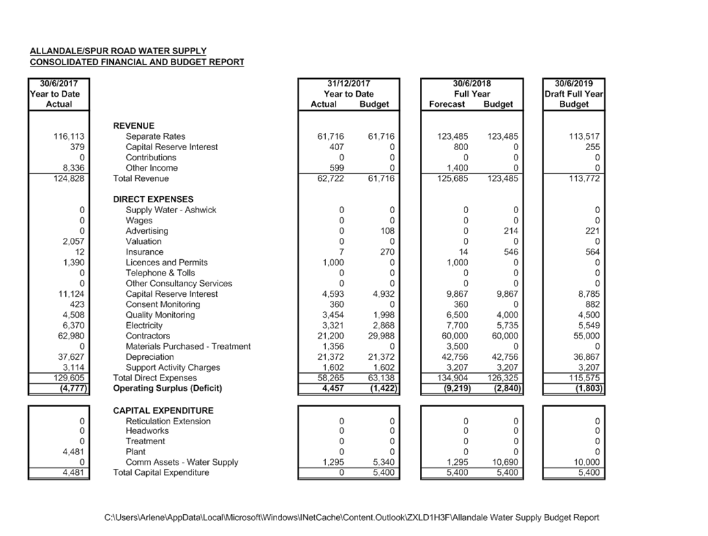 2. That the financial report for the year ended 30 June 2018 be adopted. 3. That the budget for 2019/2020 be adopted as presented. 4. That the water supply recommend to Council a rate requirement of $273.61 (GST Incl.) per unit to achieve an income requirement of $130,620 for the Allandale section of the scheme. 5. That the water supply recommend to Council a rate requirement of $187.43 (GST incl) per unit to achieve an income requirement of $12,320 for the Spur Road scheme. |